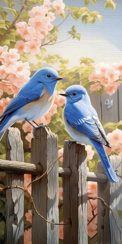 Plakat z serii natura zatytułowany Wiosna u Bram to zachwycająca ilustracja, przedstawiająca dwa błękitne ptaki, które wydają się prowadzić spokojną rozmowę, siedząc na starym drewnianym płocie. Tło kompozycji zdobią delikatne, różowe kwiaty, które tworzą romantyczny i spokojny nastrój. Subtelne światło przenika przez liście, delikatnie rozświetlając scenę i podkreślając intensywny błękit upierzenia ptaków, co przyciąga wzrok i budzi ciepłe uczucia. Ten plakat sprawdzi się jako element dekoracyjny w każdym pomieszczeniu, wprowadzając atmosferę wiosennej świeżości i naturalnego piękna. Idealny dla miłośników przyrody i delikatnej, artystycznej ekspresji.