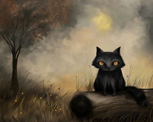Plakat z serii abstrakcja zatytułowany Czarny Kot. Przedstawia on czarnego kota o hipnotyzujących, złotych oczach, siedzącego na polanie w ciepłych promieniach zachodzącego słońca. Drzewo o gołych gałęziach i delikatne światła odbijające się w tle tworzą atmosferę tajemniczości i spokoju. Złote i brązowe odcienie sceny, połączone z subtelnymi akcentami świetlnymi, nadają ilustracji uczucie ciepła i spokojnej zadumy.Ten plakat będzie doskonałym dodatkiem do wnętrz, które pragną wprowadzić element spokoju i kontemplacji, idealny do salonu, sypialni czy gabinetu. Zapewnia on poczucie towarzystwa i spokoju, wprowadzając do pomieszczenia ciepło i urok wieczornej aury.