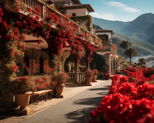 Plakat z serii pejzaże zatytułowany Czerwona Idylla, przedstawia romantyczną scenę otuloną w bujne, kwitnące bougainvillea, które zdobią klasyczną architekturę z widokiem na malownicze wzgórza. Czerwone kwiaty przypominające klejnoty, kontrastujące z ciepłą paletą pastelowych ścian i żywej zieleni, przywołują uczucie wiecznego lata. To arcydzieło znakomicie komponowałoby się w przestronnych, jasnych przestrzeniach, takich jak rezydencje w stylu śródziemnomorskim, ekskluzywne spa czy jako element wyróżniający w eleganckich restauracjach, zapraszając do marzeń o długich, leniwych dniach nad Morzem Śródziemnym.