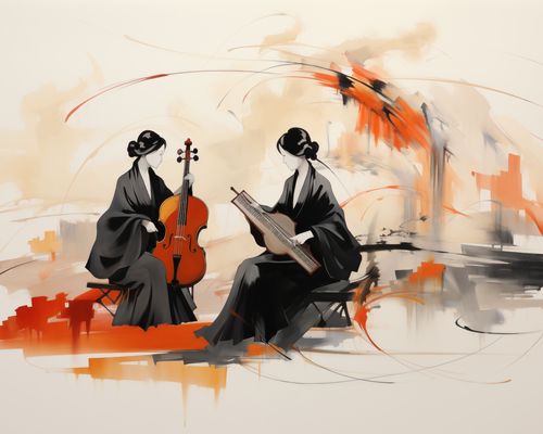 Plakat z serii motywy wschodnie zatytułowany Harmonia Ciszy to wyrafinowany plakat z serii wnętrz, przedstawiający dwie postaci w tradycyjnych japońskich strojach, głęboko zanurzone w wykonaniu klasycznej muzyki. W tle abstrakcyjne pociągnięcia pędzla w ciepłych odcieniach pomarańczu i beżu tworzą dynamiczny kontrast z spokojną postawą muzyków, dodając kompozycji nowoczesnego akcentu. Czyste linie i płynne formy instrumentów, w połączeniu z subtelną elegancją postaci, wywołują uczucie spokoju i kontemplacji. Ten plakat będzie idealnym wyborem do ozdobienia przestrzeni w salonach spa, poczekalniach klinik, ekskluzywnych hotelowych lobby czy w prywatnych przestrzeniach, gdzie dominuje spokój i relaks.
