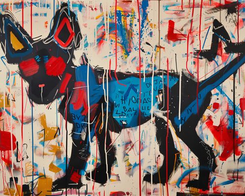 Plakat z serii abstrakcja zatytułowany Miejski Pies. Żywa kompozycja przedstawia sylwetkę psa w stylu street art w której dominują kolory takie jak czerwień, niebieski i żółty, które są rozmieszczone na płótnie w sposób dynamiczny i spontaniczny. Praca wydaje się być pełna ruchu dzięki pociągnięciom pędzlem i kroplom farby rozpryskującym się w różnych kierunkach. Na pierwszy plan wyłania się czarna sylwetka psa, której kontury są podkreślone kontrastującymi barwami i szkicowym stylem. W tle można dostrzec chaotyczne linie i formy, które mogą symbolizować miejski chaos i energię, a także fragmenty tekstu, które dodają dziełu charakteru ulicznego muralu. Całość sprawia wrażenie radosnej i pełnej energii ekspresji artystycznej. Świetnie sprawdzi się w nowoczesnych przestrzeniach miejskich.