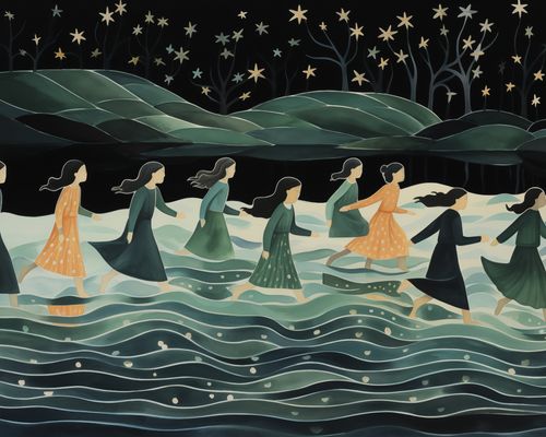 Plakat z serii wnętrza zatytułowany Nocna Procesja, przedstawia sylwetki kobiet, idących w rytmicznym ruchu przez wody, pod tajemniczym, gwiaździstym niebem. Styl plakatu, z płynnymi liniami i miękkimi pastelowymi kolorami, tworzy uczucie spokoju i onirycznej atmosfery. Postacie są przedstawione w ruchu, z włosami rozwianymi przez nocny wiatr, co dodaje dziełu poczucia tajemnicy i ruchu. Ten plakat idealnie nadaje się do wnętrz, które chcą wyrazić poczucie spokoju, introspekcji oraz kobiecej siły i solidarności, takich jak prywatne biblioteki, pokoje medytacyjne, a także przestrzenie publiczne, które pragną inspirować swoich gości do głębszego zastanowienia się nad otaczającym ich światem.