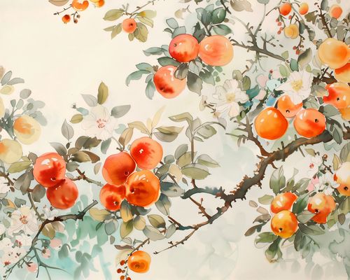 Plakat z serii abstrakcja zatytułowany Persymony. Przedstawia delikatną i kolorową ilustrację gałęzi owocowych w stylu azjatyckiej akwareli. Na obrazie widzimy rozkwitające kwiaty oraz dojrzałe, soczyste owoce persymony których intensywna pomarańczowa barwa jest pięknie wyeksponowana na tle pastelowych kolorów. Liście i gałęzie są przedstawione z subtelnymi niuansami zieleni i brązów, co dodaje głębi i naturalnego charakteru scenie. Ta sztuka łączy w sobie tradycyjne motywy i techniki malarskie z nowoczesnym podejściem do koloru i kompozycji, co czyni ją zarówno klasyczną, jak i współczesną. Plakat ten idealnie nadawałby się do przestrzeni, które cenią spokój i harmonię, takich jak salony relaksacyjne, gabinety spa, czy jako wyrafinowany akcent w domowej jadalni.