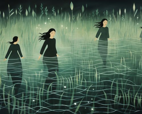Plakat z serii wnętrza zatytułowany Pośród Ciszy, przedstawia grupę postaci kobiecych, poruszających się z gracją przez mglisty, oniryczny krajobraz. Zanurzone po kolana w wodzie, otoczone przez zielone, eteryczne trawy i dyskretnie świecące światła, postacie emanują spokojem i tajemniczością. Styl plakatu, z jego płynnymi liniami i spokojnymi odcieniami zieleni, tworzy uczucie medytacyjnej głębi i harmonii z naturą. Ten plakat idealnie nadaje się do wnętrz, które pragną odzwierciedlić głęboką spokojność i introspekcję, takich jak pokoje medytacyjne, strefy relaksu, domowe biblioteki, a także jako subtelny akcent w przestrzeniach publicznych, gdzie zachęca do chwili wytchnienia i refleksji.