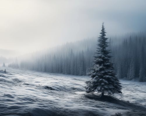 Plakat z serii pejzaże zatytułowany Samotna Choinka. Ta grafika ukazuje malowniczy, zimowy krajobraz z dominującą pojedynczą, okazałą choinką pokrytą śniegiem. Otoczona przez delikatnie zasnutej mgłą lasy, podkreśla spokój i majestatyczną ciszę zimy. Delikatne odcienie błękitu i bieli tworzą wrażenie chłodu i spokoju. Ten plakat będzie idealnym dodatkiem do każdego wnętrza, gdzie chcemy wprowadzić atmosferę spokoju i kontemplacji, świetnie sprawdzi się w przestrzeniach takich jak gabinety relaksacyjne, spa, a także jako element dekoracyjny w domowych salonach lub sypialniach.