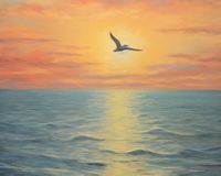 Plakat z serii pejzaże zatytułowany Serenada Nieba. Ten olśniewający plakat przedstawia moment, gdy ostatnie promienie dnia malują niebo w odcienie pomarańczy i różu, a pojedynczy ptak szybuje w stronę zachodzącego słońca. Morze rozciąga się aż po horyzont, odbijając złote światło, które nadaje scenie poczucie nieskończoności i spokoju. Doskonale nadaje się do wnętrz, które aspirują do stworzenia atmosfery spokoju i refleksji, takich jak salony, pokoje wypoczynkowe, czy przestrzenie wellness i spa.