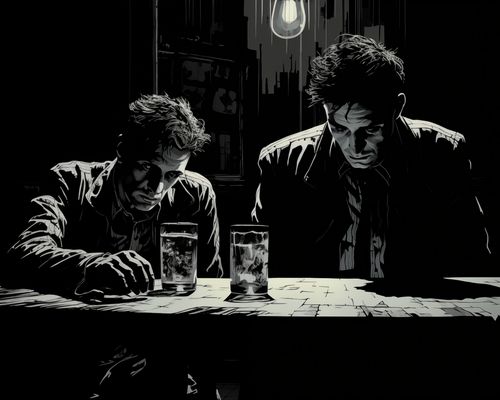 Plakat z serii abstrakcja zatytułowany Spiskowcy. Ta grafika przedstawia dwóch mężczyzn zanurzonych w głębokiej konwersacji przy barowym stole. Stylizacja na czarno-biało uchwyciła napięte, dramatyczne oświetlenie i cienie, które nadają scenie klimat tajemniczości i suspensu. Wyraźne kontury i kontrastowe światłocienie podkreślają wyraziste postaci mężczyzn i ich zacięte postawy. Plakat ten przemawia do miłośników klasycznego kina i literatury, doskonale nadając się do dekoracji przestrzeni o męskim charakterze, takich jak prywatne gabinety, domowe bary czy miejsca spotkań.