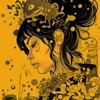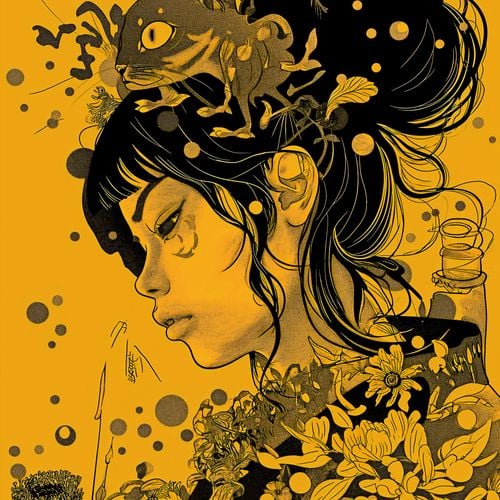 Plakat z serii motywy wschodnie zatytułowany Jedność prezentuje profil portretu młodej kobiety, którego kontury i przestrzeń wokół są wypełnione bogatym, złożonym motywem fauny i flory. Czarno-złota kolorystyka na tle w odcieniach musztardowego żółtego tworzy głęboki kontrast, który przyciąga wzrok i zmusza do refleksji. Włosy kobiety przechodzą w gęstą dżunglę roślin i zwierząt, symbolizując jedność z przyrodą. Wizualnie wyraziste i symbolicznie nasycone, dzieło artystyczne wydaje się idealne do wystroju nowoczesnych przestrzeni mieszkalnych lub miejsc publicznych, które chcą podkreślić związek z naturą i sztuką. Może być również doskonałym dodatkiem do galerii lub przestrzeni artystycznych, które cenią sobie oryginalność i głębię wizualną.