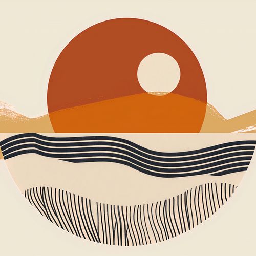 Plakat z serii boho zatytułowany Pół na Całość. Plakat przedstawia uproszczony, geometryczny krajobraz, w którym słońce jest głównym bohaterem, stanowiąc centralny punkt kompozycji. Jego okrągły kształt dominuje na tle abstrakcyjnych wzgórz i falujących linii, które mogą przypominać wzburzone morze lub piaszczyste wydmy. Kolorystyka plakatu to spokojna paleta ciepłych odcieni pomarańczu, beżu i czerni, która nadaje dziełu głębi i kontrastu.Ten plakat będzie wspaniałym dodatkiem do wnętrz urządzonych w ciepłych, ziemistych barwach, gdzie może dodać nowoczesnego charakteru. Idealnie sprawdzi się jako punkt centralny w przestrzeniach, które korzystają z naturalnego światła, takich jak salony, gabinety czy przestronne hole.