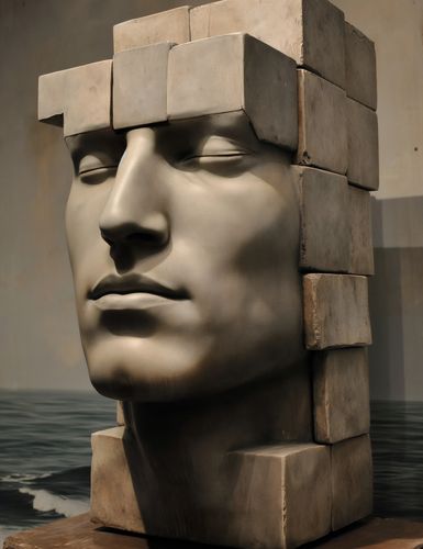 Plakat z serii abstrakcja zatytułowany Budowanie Tożsamości prezentuje monumentalną, rzeźbioną głowę, której twarz wyłania się z geometrycznych bloków kamienia. Każdy blok jest starannie dopasowany, tworząc wrażenie, że osobowość i myśli postaci są złożone z wielu fragmentów. Stonowana paleta barw, od jasnych beżów do głębokich brązów, wzmacnia wrażenie solidności i trwałości, a jednocześnie podkreśla ludzką cechę bycia dziełem w trakcie budowy. Ten plakat mógłby być inspirującym dodatkiem do przestrzeni takich jak biura, domowe gabinety, czy też miejsca publiczne, gdzie prowokuje do refleksji nad ludzką naturą i procesem kształtowania własnej tożsamości.