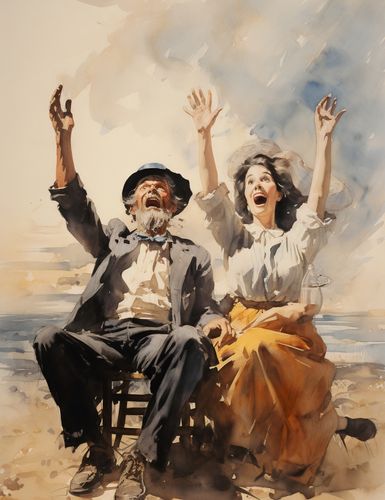 Plakat z serii wnętrza zatytułowany Chwile Radości. Pełne życia i entuzjazmu postacie starego mężczyzny w kapeluszu i młodej kobiety w białej bluzce, obaj z uniesionymi rękami w geście ekscytacji. Tło z rozmazanymi akwarelowymi chmurami i brzegiem morza dodaje uczucie swobody i nieskrępowanej radości. Złote i błękitne odcienie obrazu harmonizują ze sobą, tworząc atmosferę beztroski. Idealny do ozdobienia przestrzeni kawiarnianych, artystycznych galerii lub domowych salonów pragnących wprowadzić do swojego wnętrza nutę optymizmu i spontaniczności.