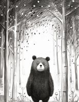 Plakat z serii wnętrza zatytułowany Ciekawski Miś. Ten uroczy plakat ilustracyjny przedstawia przyjaznego, czarno-białego misia stojącego na dwóch nogach w środku leśnej polany, patrzącego z ciekawością w górę na delikatnie opadające płatki śniegu. Stylizowany na rysunek piórkiem z miękkimi odcieniami szarości, wprowadza atmosferę spokoju i zaciekawienia naturą. Idealny do ozdoby pokoju dziecięcego, jako element dekoracyjny w przestrzeniach edukacyjnych lub jako ciepły akcent w domowych salonach.