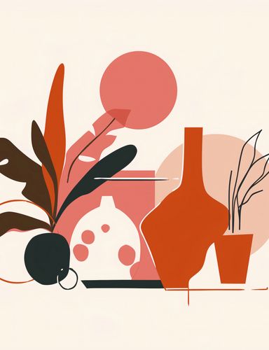 Plakat z serii minimalistyczne zatytułowany Ciepłe Gesty. Grafika składa się z eleganckiej kombinacji abstrakcyjnych form, stylizowanych wazonów i roślinnych motywów, w których dominują ciepłe odcienie czerwieni, różu oraz neutralne tony. Całość tworzy przyjemną dla oka i zrelaksowaną kompozycję, która łączy elementy sztuki nowoczesnej z naturalnymi akcentami. Ten plakat będzie pięknym dodatkiem do wnętrz o spokojnej, relaksującej atmosferze, jak również do przestrzeni, które cenią prostotę i elegancję w designie. Może znaleźć swoje miejsce w jasnych salonach, biurach, a nawet w recepcjach hotelowych, gdzie może dodać odrobinę ciepła i estetycznego spokoju.