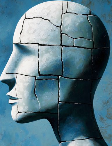 Plakat z serii abstrakcja zatytułowany Defragmentacja Dysku przedstawia abstrakcyjny portret ludzkiej głowy, której powierzchnia przypomina popękaną ceramikę. Wyraziste pęknięcia podkreślają strukturę twarzy i mogą symbolizować złożoność ludzkiego umysłu, jego podatność na zmiany i przemijanie, lub rozbudowaną naturę myśli i emocji. Niebieskie tło kontrastuje z bielą i cieniami na twarzy, dodając głębi i podkreślając kontemplacyjny nastrój dzieła. Ten plakat mógłby być idealny dla przestrzeni kreatywnych, takich jak studia artystyczne, gabinety psychologiczne lub jako element zastanawiający w nowoczesnych biurach i mieszkaniach, zachęcający do refleksji nad ludzką kondycją i wewnętrznym życiem umysłu.
