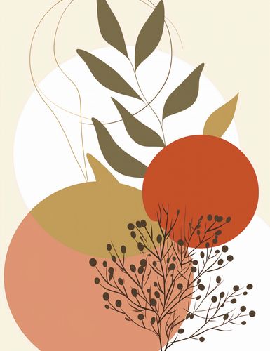 Plakat z serii minimalistyczne zatytułowany Impresja Jesieni.Grafika ta jest dynamiczna i wyważona, z pogłębioną paletą kolorów nawiązującą do jesiennego sezonu. Użyte odcienie czerwieni, pomarańczy i beżu, wsparte głęboką zielenią, wprowadzają uczucie ciepła i spokoju. Delikatne linie i formy przypominają o płynącym czasie i zmienności natury. Plakat ten mógłby być doskonałym akcentem w pomieszczeniach o neutralnym wystroju, wprowadzając element sezonowej zmiany i podkreślając naturalną elegancję przestrzeni.