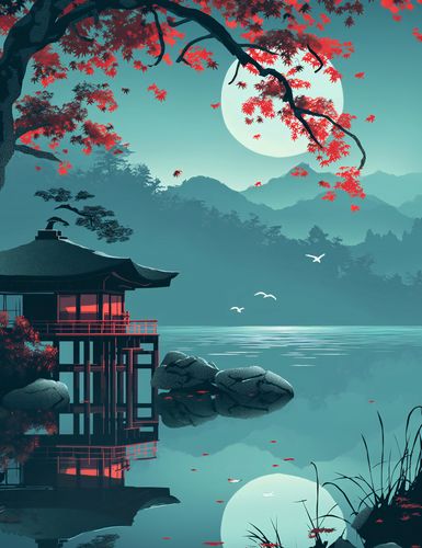 Plakat z serii motywy wschodnie zatytułowany Japoński Pawilon. Ten plakat emanuje spokojem dzięki scenie przedstawiającej tradycyjny japoński pawilon, otoczony przez wodę i delikatnie pochylające się czerwone liście klonu. Ciepłe światło wschodzącego księżyca i subtelne odbicie w wodzie podkreślają atmosferę ciszy i refleksji. Delikatne sylwetki przelatujących ptaków dodają element życia i ruchu. Plakat ten idealnie wpisuje się w przestrzenie współczesne, minimalistyczne, a także te, które celebrują naturę i spokój, takie jak pokoje do medytacji, jadalnie, czy też poczekalnie w spa.