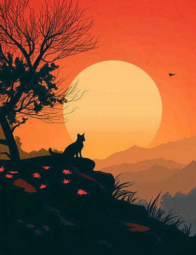 Plakat z serii abstrakcja zatytułowany Kocie Wzgórze ukazuje sylwetkę kota, który usadowił się na wzgórzu, wpatrując się w zachodzące słońce. W tle rozciągają się warstwowe góry, a całość sceny jest nasączona ciepłymi odcieniami pomarańczy i czerwieni, wyrażającymi spokój i harmonię. Drzewo bez liści na pierwszym planie oraz rozsypane po ziemi jesienne liście kontrastują z gładkim tłem, tworząc poczucie głębi i przestrzeni. Ten plakat doskonale oddaje spokojną i refleksyjną atmosferę, idealnie nadając się do pomieszczeń, które cenią sobie ciszę i spokój, takich jak biblioteka, salon, czy miejsce do medytacji.