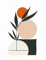 Plakat z serii boho zatytułowany Kompozycja Natury. Grafika łączy proste formy geometryczne z elementami przyrody, tworząc obraz, który jest jednocześnie nowoczesny i organiczny. Zestawienie gładkich, zaokrąglonych kształtów z ostrymi, ciemnymi liśćmi wprowadza wizualne napięcie, a pomarańczowa kula na wierzchołku gałązki przypomina zachodzące słońce lub soczysty owoc. Palecie barw dominują stonowane odcienie, które razem tworzą kojącą i zrelaksowaną atmosferę.Dzieło to doskonale sprawdzi się w przestrzeniach, które aspirują do stworzenia spokojnego i zbalansowanego wnętrza, takich jak jadalnie, poczekalnie lub pokoje relaksacyjne. Może także pełnić funkcję spajającą w pomieszczeniach z elementami zielonymi, takimi jak domowe ogrody zimowe czy salony w stylu eko.