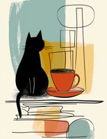 Plakat z serii abstrakcja zatytułowany Kot i Kawa. Ten pełen uroku plakat przedstawia sylwetkę czarnego kota, który wydaje się kontemplować filiżankę kawy. Stylizacja grafiki, z jej czystymi liniami i blokami kolorów w ciepłych odcieniach beżu, ochry oraz stonowanej zieleni i błękitu, tworzy atmosferę spokojnego poranka. Abstrakcyjne elementy w tle, przypominające sztukę modernistyczną, nadają plakatowi współczesnego charakteru. To dzieło sztuki idealnie pasuje do kawiarni, kuchni, a także jako subtelny akcent w nowoczesnym salonie, oferując wizualne wyrażenie komfortu i relaksu.