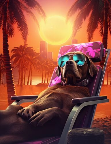 Plakat z serii pop art zatytułowany Lato w Stylu. Na tej zabawnej ilustracji widzimy psa rasy labrador, wygodnie ułożonego na leżaku plażowym, w okularach przeciwsłonecznych, z tłem zachodzącego słońca i palm. Jego relaksująca poza i luźny styl, w połączeniu z żywymi kolorami tropikalnego wschodu lub zachodu słońca, oddają atmosferę beztroskich wakacji. Plakat ten jest idealnym wyborem dla miłośników psów i letnich klimatów, świetnie nadaje się do dekoracji ścian w domach, hotelach nad morzem, czy jako dodatek do letnich barów i restauracji, wprowadzając element humoru i wakacyjnego luzu.