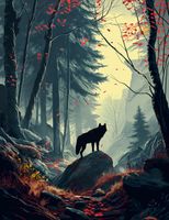 Plakat z serii natura zatytułowany Leśne Echa. Ilustracja przedstawia samotnego wilka stojącego na skale, który wpatruje się w mglistą dal tajemniczego lasu. Złote światło przebijające się przez drzewa nadaje scenie spokojną, ale zarazem majestatyczną atmosferę. Jesienne liście w odcieniach czerwieni kontrastują z chłodnymi tonami otoczenia, podkreślając zmienność sezonów. Plakat ten oddaje uczucie zadumy i połączenia z naturą, będąc idealnym dodatkiem do wnętrz, które cenią sobie spokój i dziką przyrodę, takich jak górskie chaty, saloniki z kominkiem lub przestrzenie wypoczynkowe.