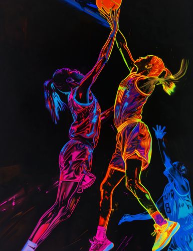 Plakat z serii abstrakcja zatytułowany Mecz W Kosza. Przedstawia żywą i dynamiczną scenę z gry w koszykówkę, w której dwie zawodniczki rywalizują o piłkę. Graczka w pierwszym planie wykonuje skok do kosza w akcie rzutu lub bloku, rozciągając się w pełnej koncentracji, podczas gdy jej przeciwniczka stara się ją zablokować. Figury sportowców są przedstawione w intensywnych, neonowych kolorach, które kontrastują z ciemnym tłem, co nadaje scenie energiczny i ekscytujący charakter. Kolory są rozmieszczone na postaciach w sposób, który podkreśla ich ruch i ekspresję, a także oddaje dynamikę i szybkość sportowej akcji. Plakat ten idealnie oddaje ducha sportowej rywalizacji i mogłby być inspirującym dodatkiem do wnętrza dla miłośników koszykówki i sportu.