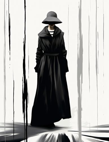 Plakat z serii wnętrza zatytułowany Mroczna Taina. Enigmatyczna postać w czarnym płaszczu i szerokim kapeluszu ukrywa swoją tożsamość, podkreślając aura tajemniczości. Czarno-białe tło z pionowymi smugami przypominającymi deszcz lub płynący atrament dodaje głębi i dramatyzmu kompozycji. Subtelne niuanse światła i cienia grają na powierzchni płaszcza, tworząc atmosferę intrygi i nieokreślonego niebezpieczeństwa. Świetnie sprawdzi się w nowoczesnych galeriach sztuki, luksusowych hotelach o minimalistycznym designie oraz w przestrzeniach przeznaczonych dla miłośników noir i kryminałów.