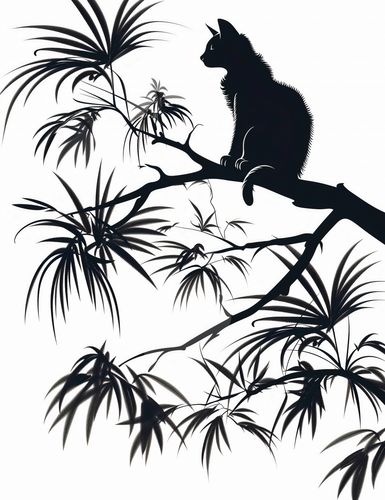 Plakat z serii wnętrza zatytułowany Na Gałęzi przedstawia sylwetkę kota siedzącego na gałęzi, zarysowaną na tle jasnego, jednolitego tła. Całość kompozycji utrzymana jest w stylu sumi-e, nawiązującym do tradycyjnej wschodniej techniki tuszem. Kontury kota i roślin są wyraziste, z delikatnymi szczegółami, które przywodzą na myśl efekt cieniowania i głębi. W tle roślinność, prawdopodobnie bambus lub tropikalne palmy, jest przedstawiona w sposób stonowany, co wskazuje na użycie gradientu cieni. Grafika ta oddaje spokój i harmonię, charakterystyczne dla azjatyckiej estetyki i sztuki. Idealnie nadawałaby się jako dekoracja w przestrzeniach inspirowanych minimalizmem i naturą.