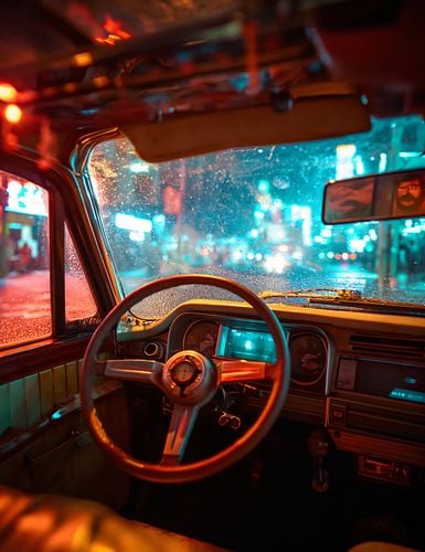 Plakat z serii pop art zatytułowany Nocny Kierowca, przedstawia widok z wnętrza klasycznego samochodu, patrząc przez deszczową, skraplaną szybę na rozświetlone neony miejskiego pejzażu nocą. Ciepłe, czerwone oświetlenie wnętrza samochodu kontrastuje z hipnotyzującym błękitem i elektrycznymi odcieniami świateł zewnętrznych, tworząc intymną, a jednocześnie dynamiczną atmosferę. Kropelki deszczu na szybie dodają tekstury i głębi, sprawiając, że scena jest zarówno realistyczna, jak i liryczna. To dzieło sztuki mogłoby znaleźć swoje miejsce w przestrzeniach nowoczesnych, miejskich loftów lub jako akcent w barze o tematyce retro, wprowadzając element tajemniczości i miejskiego romansu.