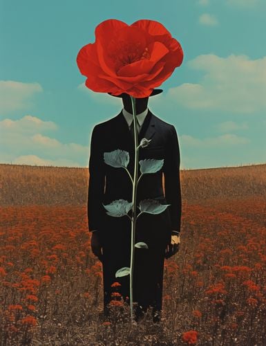 Plakat z serii abstrakcja zatytułowany Obserwator zza Maku. Ten plakat przedstawia surrealistyczny obraz człowieka z głową w formie rozkwitającego czerwonego maku, stojącego na polu pełnym kwiatów tej samej rośliny. Kompozycja gra na kontraście między ludzką postacią a bujnością natury, podkreślając połączenie człowieka z otaczającym go światem. Idealny dla przestrzeni szukających głębi artystycznej i wizualnej prowokacji, ten plakat będzie doskonałym dodatkiem do nowoczesnych salonów, galerii sztuki czy przestrzeni kreatywnych, gdzie może inspirować i wywoływać refleksję.