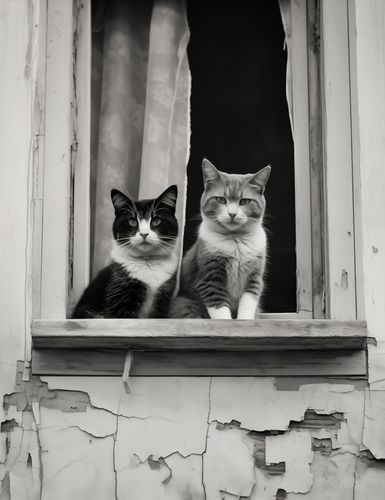Plakat z serii wnętrza zatytułowany Para w Oknie. Uchwycenie momentu, w którym dwa koty o spokojnych i pełnych godności spojrzeniach pozują w oknie zaniedbanej fasady. Czarno-białe tło fotografii dodatkowo wzmacnia ich wyraziste, charakterystyczne wzory na sierści. Ten obraz to nie tylko urokliwa scena z życia miejskich kotów, ale również piękna metafora o spokoju i zgodzie, jaką można odnaleźć w najprostszych momentach codzienności. Plakat ten będzie wyjątkowym dodatkiem do każdego wnętrza, szczególnie polecany dla miłośników zwierząt i estetyki vintage, a także jako element ozdobny w kawiarniach czy księgarniach, który wnosi element ciepła i domowego klimatu.