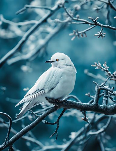 Plakat z serii natura zatytułowany Perłowy Ptak przedstawia urokliwy obraz białego ptaka, który spoczywa na gałęzi drzewa. Ptak, o perłowo białym upierzeniu i przejmujących pomarańczowych oczach, wydaje się być wyizolowany od świata, znajdując ukojenie w zimowej aurze. Tło w chłodnych, niebieskich tonacjach kontrastuje z ciepłym akcentem koloru oczu ptaka, tworząc atmosferę harmonii i spokoju. Delikatne szrony na gałęziach dodają obrazowi delikatności i subtelności, zaś skomponowany w minimalistycznej estetyce, ten plakat jest idealny do wnętrz, które cenią sobie spokój, elegancję oraz kontakt z naturą. Doskonale wpasuje się w przestrzenie takie jak salony relaksacyjne, gabinety terapeutyczne czy nawet jako ukojenie dla oczu w dynamicznie zmieniających się współczesnych biurach.