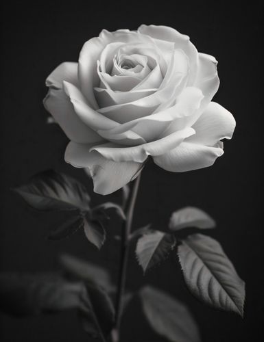 Plakat z serii wnętrza zatytułowany Płatki Róż. Plakat przedstawia ponadczasowy, monochromatyczny obraz róży. Róża, z delikatnymi i szczegółowymi płatkami, jest wyeksponowana na ciemnym tle, co wyostrza jej obrys i podkreśla subtelne niuanse jej formy. Gra światła i cienia nadaje głębi i trójwymiarowości, a ułożenie płatków w pełnym rozkwicie symbolizuje piękno i doskonałość. Liście i łodyga są skromne, ale wyraźne, dodając naturalności całej kompozycji. Plakat oddaje esencję delikatności i elegancji róży, co sprawia, że jest idealny dla każdego, kto szuka elementu dekoracyjnego o subtelnym pięknie i spokojnej, relaksującej estetyce.