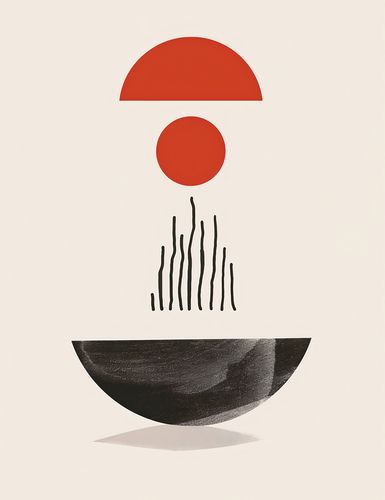Plakat z serii boho zatytułowany Półokrągła Forma.Na tej grafike zmysłowe, geometryczne kształty tworzą obraz, który równie dobrze może być interpretacją wschodu słońca, jak i abstrakcyjnym przedstawieniem równowagi w przyrodzie. Półokrągła, czerwona forma nad czarną, pionową linią może sugerować słońce wschodzące nad cichym jeziorem, a czerwony krąg pośrodku może być metaforą istoty życia. Duża, ciemna forma na dole to ziemia lub możliwe odbicie, a całość kreuje uczucie pełni i harmonii.Plakat wprowadzi do wnętrza poczucie spokoju i wyważenia. Jest idealny dla tych, którzy chcą dodać do swojej przestrzeni element medytacyjny, pobudzający do refleksji. Doskonale pasuje do minimalistycznych salonów, biur, a także jako element zen w sypialniach, wprowadzając atmosferę oczyszczenia i wewnętrznej równowagi.