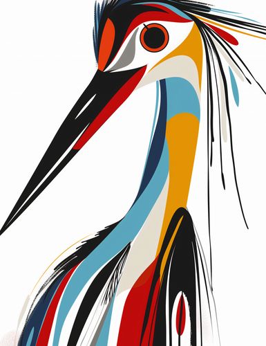 Plakat z serii abstrakcja zatytułowany Portret to abstrakcyjne przedstawienie bociana, w stylu modernistycznej grafiki. Ptak jest przedstawiony przy użyciu odważnych, czystych linii i jasnych, kontrastujących barw, które łączą się w dynamiczną i nowoczesną kompozycję. Linie tworzą zarys ptaka, a kolorowe płaszczyzny - od czerwieni, poprzez błękity, aż po odcienie żółci i czerni - nadają głębi i charakteru jego postaci. Akcenty kolorystyczne, jak czerwone pióro czy niebieski akcent na szyi, dodają dziełu energii i wyrazistości. Plakat jest żywy i pełen charakteru, idealny do wnętrz, które szukają silnego wizualnego akcentu, takich jak współczesne salony, galerie sztuki, czy przestrzenie kreatywne.