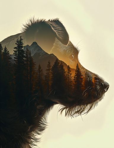 Plakat z serii natura zatytułowany Psi Duch Lasu ukazuje zjawiskowe połączenie sylwetki psa z krajobrazem górskim. Pięknie uchwycony profil psa, z jego czujnym spojrzeniem i delikatnymi liniami twarzy, płynnie przechodzi w malownicze góry, które wyłaniają się z jego sylwetki. Drzewa sosnowe i złociste światło zachodzącego słońca tworzą tło, które emanuje spokojem i harmonią. Kontur psa jest wyraźnie zarysowany, a jednocześnie subtelnie stapia się z przyrodą, co podkreśla nierozerwalną więź między zwierzętami a ich naturalnym środowiskiem. Ten plakat idealnie wpasuje się w wnętrza inspirowane naturą, w salonach miłośników zwierząt lub jako dekoracja w weterynaryjnych poczekalniach, przypominając o pięknie i sile natury oraz naszej odpowiedzialności za jej ochronę.