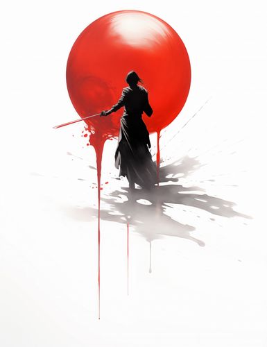 Plakat z serii motywy wschodnie zatytułowany Samotny Samuraj przedstawia postać w tradycyjnym japońskim stroju, samuraja, w dynamicznej pozie z mieczem, z potężnym, czerwonym słońcem w tle. Design wykorzystuje silne kontrasty kolorystyczne - biel i czerń z akcentami czerwieni, aby stworzyć dramatyczną i potężną wizualizację. Przedstawienie samuraja w akcji z rozpryskami tuszu naokoło podkreśla ruch i energię, a jednocześnie oddaje hołd tradycyjnym technikom japońskiego malarstwa atramentem. Ten plakat to doskonały wybór dla miłośników japońskiej kultury i sztuk walki, idealny do wnętrz nowoczesnych jak i tych o bardziej klasycznym charakterze.