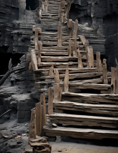 Plakat z serii pejzaże zatytułowany Schody do Nieznanego. Ten tajemniczy i intrygujący plakat przedstawia prymitywne, drewniane schody prowadzące w górę przez strukturę przypominającą starożytną ruiny lub naturalne formacje skalne. Zanurzone w półmroku, schody te wydają się zapraszać odkrywców do podjęcia podróży w nieznane, pełnej nieoczekiwanych odkryć. Plakat ten idealnie oddaje uczucie odkrycia i przygody, idealny dla przestrzeni zainspirowanych historią, naturą, czy literaturą eksploracyjną. Może stanowić inspirujący element w domach, biurach, a także w przestrzeniach publicznych takich jak kawiarnie tematyczne lub księgarnie.