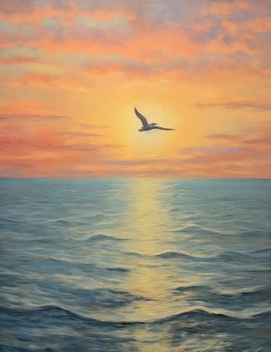 Plakat z serii pejzaże zatytułowany Serenada Nieba. Ten olśniewający plakat przedstawia moment, gdy ostatnie promienie dnia malują niebo w odcienie pomarańczy i różu, a pojedynczy ptak szybuje w stronę zachodzącego słońca. Morze rozciąga się aż po horyzont, odbijając złote światło, które nadaje scenie poczucie nieskończoności i spokoju. Doskonale nadaje się do wnętrz, które aspirują do stworzenia atmosfery spokoju i refleksji, takich jak salony, pokoje wypoczynkowe, czy przestrzenie wellness i spa.