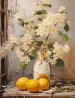 Plakat z serii wnętrza zatytułowany Słodkie Chwile. Delikatne białe kwiaty o subtelnym żółtym środku rozkwitają pełnym blaskiem obok dojrzewających cytryn, które wyróżniają się na tle w delikatnych pastelowych odcieniach. Starannie postarzana butelka i rustykalne drewno dodają nuty nostalgii i spokoju do tej kompozycji. Delikatna gra światła i cienia tworzy głęboką atmosferę i dodaje ciepła do sceny. Świetnie sprawdzi się w kawiarniach o prowansalskim stylu, domowych jadalniach dla tych, którzy pragną dodać do swojej przestrzeni odrobinę wiejskiego uroku, czy też w hotelach, gdzie chce się podkreślić elegancję i ciepło naturalnych elementów.