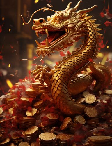 Plakat z serii motywy wschodnie zatytułowany Smok Bogactwa. Ilustracja ta ukazuje potężnego złotego smoka, symbol siły i pomyślności w wielu kulturach wschodnich, unoszącego się nad skarbami. Smok, z szeroko otwartymi szczękami, wydaje się ryczeć triumfalnie, otoczony przez wirujące złote monety i kwiaty, co dodaje kompozycji dynamizmu. Żywe kolory i szczegółowe wykonanie smoka sprawiają, że plakat jest pełen życia i energii. Plakat ten jest doskonałym wyborem dla miłośników sztuki orientalnej oraz jako element dekoracyjny wnętrz, które chcą wprowadzić elementy bogatej symboliki i kulturowej głębi, takich jak domowe biura, pokoje do medytacji czy ekskluzywne salony.