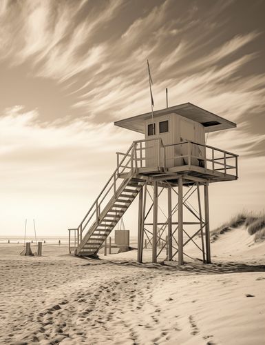 Plakat z serii pejzaże zatytułowany Strażnik Wydm. Prezentuje on sepiową scenę z wieżą ratownika na pustej plaży. Nostalgiczna tonacja obrazu podkreśla samotność struktury i piękno otaczającej ją dzikiej przyrody. Dramatyczne chmury na niebie i ślady na piasku prowadzą wzrok ku wieży, dodając głębi i historii miejscu. Ten plakat idealnie nadaje się do wnętrz, w których pragnie się wywołać uczucie spokoju, przestrzeni i czasów minionych, takich jak salony, pokoje wypoczynkowe, a także przestrzenie publiczne lub prywatne biura, które cenią sobie klasyczny wygląd i atmosferę.