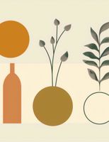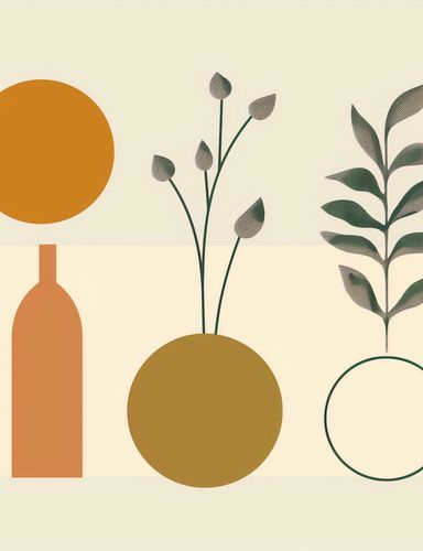 Plakat z serii boho zatytułowany Symfonia Równowagi. Plakat łączy organiczne kształty roślin z rygorystyczną formą geometrii. Prezentuje on wazony w spokojnych odcieniach brązu i złota, z których jeden jest ozdobiony gałązkami z delikatnymi pąkami, a drugi pokazuje symetryczny wzór liści. Proste linie i figury geometryczne, takie jak okrąg i prostokąt, tworzą tło dla roślinności, przypominając o ludzkiej próbie ujarzmienia natury. Całość osadzona na pastelowym tle wywołuje uczucie spokoju i harmonii. To dzieło będzie pasowało do przestrzeni, które cenią równowagę między naturą a stworzonym przez człowieka porządkiem, jak eleganckie gabinety, przestrzenie wellness lub strefy odpoczynku, które dążą do stworzenia oazy spokoju w zabieganym świecie.