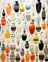 Plakat z serii wnętrza zatytułowany Symfonia Wazonów. Wspaniałe wazony w bogatej palecie kolorów, od głębokiej czerni do ciepłych odcieni pomarańczu, tworzą intrygującą mozaikę wzorów i kształtów. Delikatne motywy roślinne, które zdobią niektóre wazony, dodają uroku i lekkości, a różnorodność wzorów i faktur przyciąga wzrok i zaprasza do głębszej refleksji. Kontrast między jasnymi i ciemnymi barwami, a także subtelne niuanse w każdym wazonie, dodają tej kompozycji głębi i dramatu. Ten artystyczny plakat doskonale wpisuje się w klimat wyrafinowanych galerii sztuki, eleganckich kawiarni oraz nowoczesnych przestrzeni mieszkalnych, które stawiają na unikatowy design.