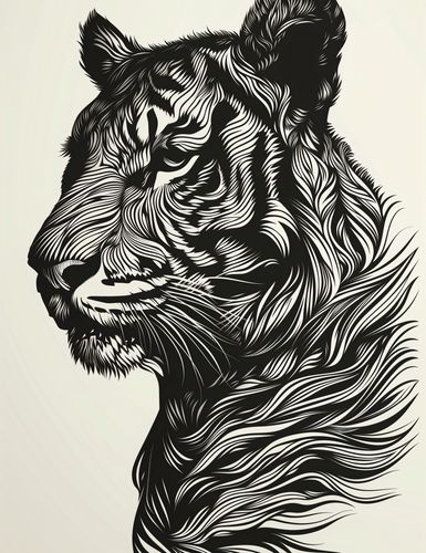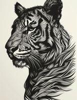 Plakat z serii wnętrza zatytułowany Tygrysi Gwizd. Ta dramatyczna grafika przedstawia tygrysa w stylu linorytu, z wyraźnymi, płynnymi liniami układającymi się w złożony wzór futra. Monochromatyczna paleta, z ciemnymi i jasnymi odcieniami na neutralnym tle, podkreśla majestatyczną postawę i intensywny wzrok tego dzikiego zwierzęcia. Plakat emanuje siłą i elegancją, oddając w pełni królewski charakter tygrysa. Idealny do wnętrz urządzonych w stylu minimalistycznym lub nowoczesnym, będzie także pasował do przestrzeni, które chcą podkreślić motywy przyrodnicze lub eksplorować tematykę ochrony dzikiej przyrody.