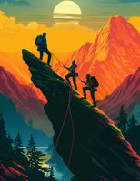 Plakat z serii abstrakcja zatytułowany U Szczytu przedstawia grupę wędrowców wspólnie zdobywających szczyt górski przy zachodzie słońca. Scena jest nasączona żywymi odcieniami pomarańczy i czerwieni, które tworzą dramatyczny, ale piękny kontrast z ciemnozielonymi drzewami i skalistym terenem. Sylwetki wędrowców są w centrum kompozycji, wyraźnie zarysowane przeciwko tłu światła słonecznego, co podkreśla ich osiągnięcie i trud włożony w zdobycie szczytu. Przepiękny zachód słońca z dużym, jasnym słońcem na horyzoncie nadaje całej scenie uczucie spokoju i spełnienia. Plakat ten oddaje ducha przygody i piękno natury, idealny dla miłośników gór i tych, którzy cenią siłę ludzkiego ducha. Doskonały do dekoracji ścian w domach, schroniskach górskich lub jako inspiracja w przestrzeniach, gdzie docenia się przyrodę i aktywny tryb życia.