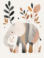 Plakat z serii wnętrza zatytułowany Wypocznij Mały przedstawia stylizowaną ilustrację słonia, wplecionego w delikatną kompozycję z abstrakcyjnymi elementami roślinnymi. Słoń jest przedstawiony w spokojnej, stonowanej palecie kolorów z akcentami ciepłych brązów, beżów i delikatnych szarości, co nadaje ilustracji elegancki i nowoczesny charakter. Proste, ale efektowne formy roślinne wokół słonia dodają plakatowi lekkości i harmonii, a dyskretne kropki i linie na ciele słonia tworzą wrażenie tekstury. Całość tworzy obraz spokoju i łagodności, idealny do wnętrz, w których chce się wprowadzić elementy natury i uspokajającej estetyki, takich jak salony, pokoje relaksacyjne lub przestrzenie dla dzieci.