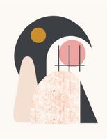 Plakat z serii boho zatytułowany Zakres Widoku.Plakat przedstawia abstrakcyjną kompozycję łączącą kształty zakrzywione i geometryczne, wykorzystującą miękką i spójną paletę kolorów. Dominujące kolory to czarny, odcienie różu, beż oraz akcent żółtego, tworząc poczucie równowagi i nowoczesnej estetyki. Kompozycja składa się z nakładających się form, w tym dużej czarnej figury z wycięciem koła, przez które prześwituje część różowego koła, oraz żółtego koła umieszczonego w obszarze czarnym, co może sugerować ciało niebieskie typu księżyc lub słońce. Obecne są również elementy fakturalne, dodające głębi i intrygi jednemu z kształtów, a proste linie przecinają różowe koło, przyczyniając się do wizualnego zainteresowania dziełem. Całość kompozycji przekazuje spokojne i współczesne wrażenie, prawdopodobnie czerpiąc inspirację z natury i sztuki abstrakcyjnej.