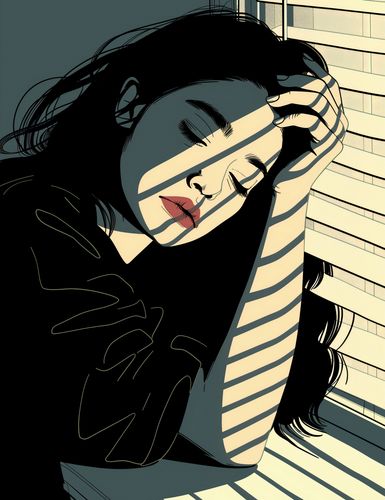 Plakat z serii abstrakcja zatytułowany Zamysł. Plakat przedstawia kobietę z zamyślonym wyrazem twarzy, z głową opartą na dłoni, co sugeruje moment introspekcji lub smutku. Silne cienie i linie świetlne tworzące prążki na jej twarzy dodają głębi kompozycji, a kontrastująca paleta kolorów z dominującymi odcieniami niebieskiego i czerni, podkreślona akcentem czerwieni ust, potęguje emocjonalne napięcie dzieła. Ten plakat może symbolizować skomplikowane emocje ludzkiego doświadczenia i jest idealnym dodatkiem do przestrzeni, które cenią sobie głębię i wyrazistość w sztuce, takich jak salon, studio twórcze, czy miejsce do medytacji.