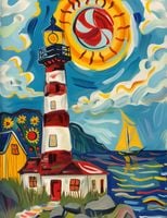 Plakat z serii abstrakcja zatytułowany Żywa Przystań to wesoła i barwna ilustracja przedstawiająca latarnię morską w nadmorskim pejzażu. Wyraziste, kręte linie i żywe kolory nadają scenie energii i ruchu, a dynamiczne słońce z żaglówką na tle morskich fal tworzy optymistyczny obraz. Latarnia morska, z jej klasycznymi czerwono-białymi pasami, stoi dumnie obok uroczego żółtego domku, a całość jest otoczona przez stylizowane kwiaty i roślinność. Styl przypomina ekspresjonistyczne dzieła z początku XX wieku, pełne życia i radości. Ten plakat jest idealny do rozjaśnienia każdego pomieszczenia, nadając mu ciepła i pozytywnej energii, świetnie sprawdzi się w przestrzeniach takich jak salony, pokoje dziecięce czy miejsca publiczne, gdzie może wprowadzić atmosferę spokoju i radosnego spędzania czasu.